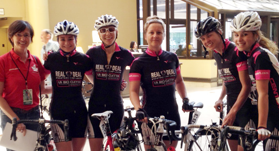 L’équipe Real Deal Racing/La Bicicletta : Mary Costelloe, moi, Arlene Marchildon, Myriam Gaudreault, Gabrielle Pilote en compagnie de Denise Kelly attrapée au passage pour la photo !